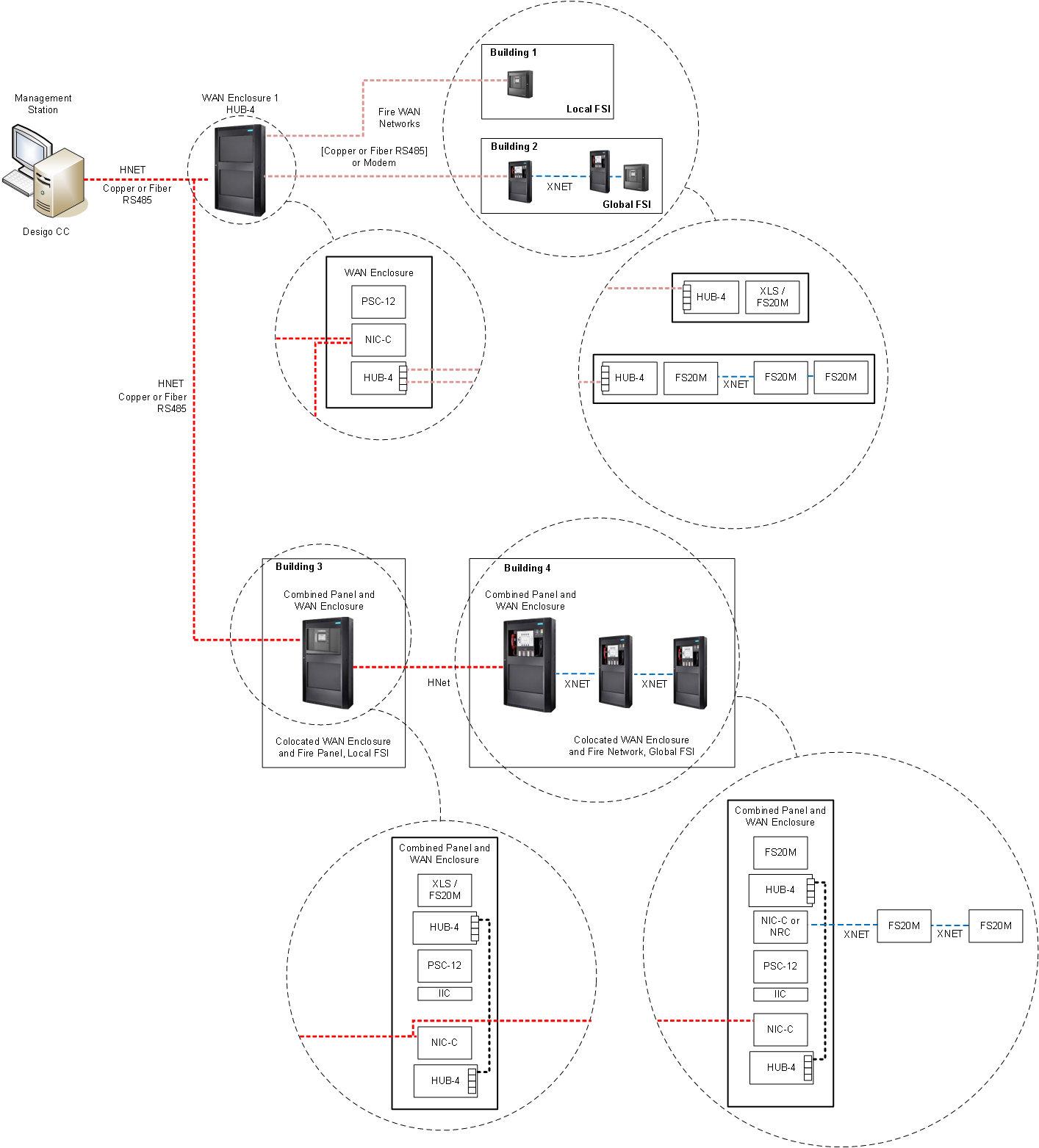 - WAN Enclosure connected to a fire control panel in Local FSI mode (Building 1).