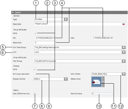 The available entry fields depend on the data point type, see Value Attributes for Different Data Point Types, below. The examples listed here are for the real data point type.