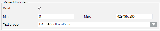 Defines the normal state for the property. The entry field for defining normal state depends on the data point type (Enumeration, Real, Boolean and Bitstring) as well as the selected text catalog. For details see Normal Value Entry Fields.