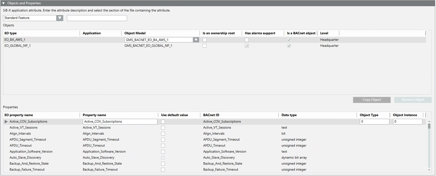 This section presents all the EO types (objects) contained in the SiB-X file of a given family. They are clearly indicated as BACnet objects. For each object it is possible to: