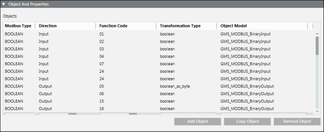 Suppose, in the CSV, you specify BOOLEAN as ModbusType, 1 as the Function Code and Input as the Direction. Then while creating the instance, the Importer will create an instance of GMS_MODBUS_BinaryInput and assign Boolean as TransformationType in the address configuration.
