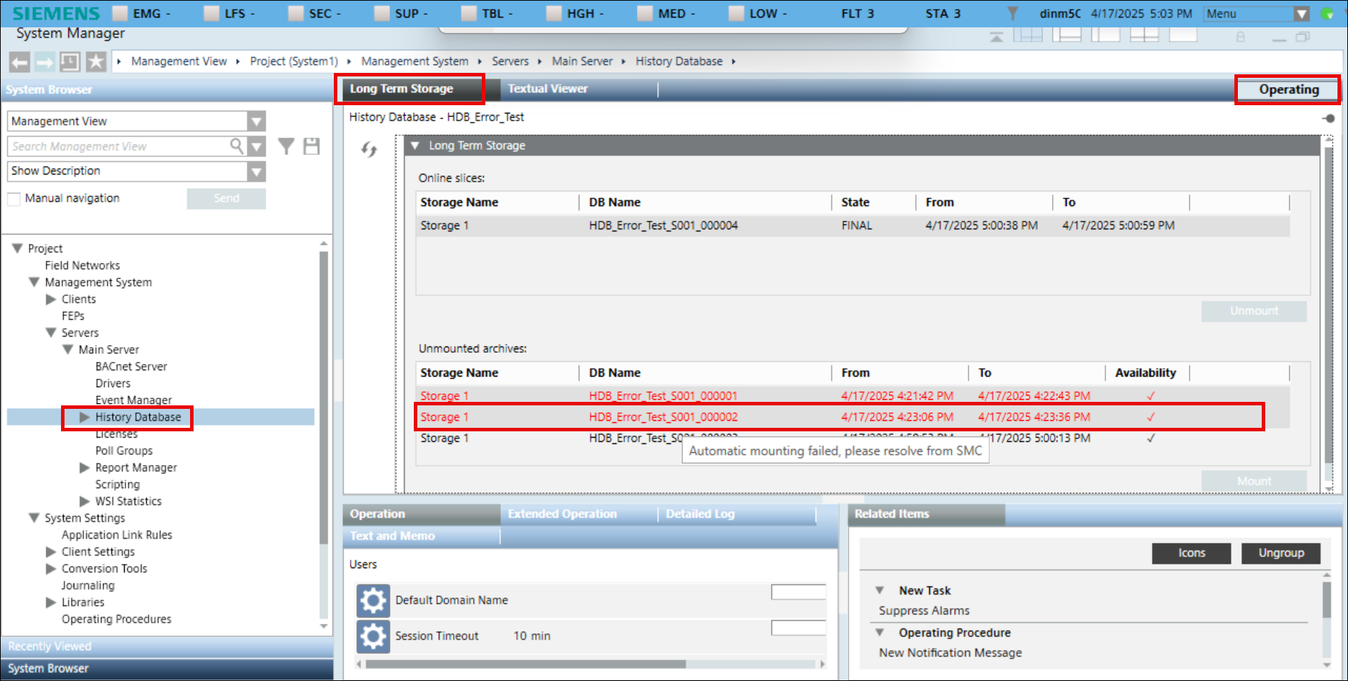PlannedState. - If the HDB Service user of the unmounted slice (backup) does not match the current HDB service user configured on the System node of SMC then the mount operation might fail as shown in the below image.