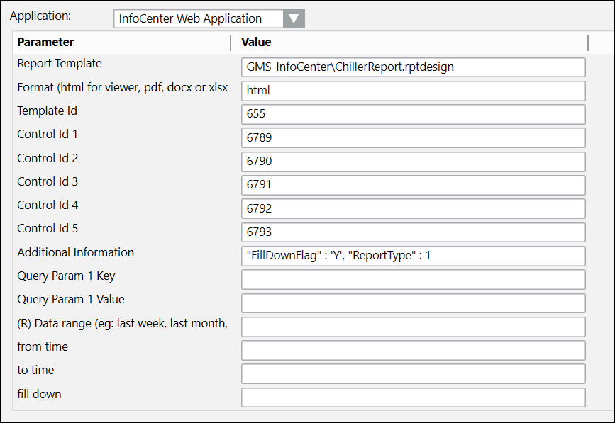 Template and Control IDs will not be the same as the example below. These values vary depending on the user and on the details of the reports in the InfoCenter database.