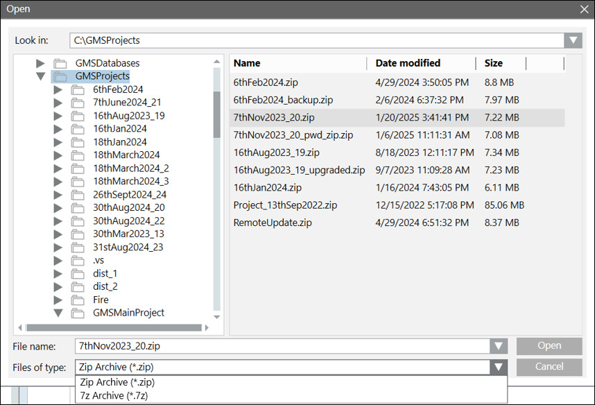 - Set the Files of type to either Zip Archive (*.zip) or 7z Archive (*.7z) to filter the project backups.