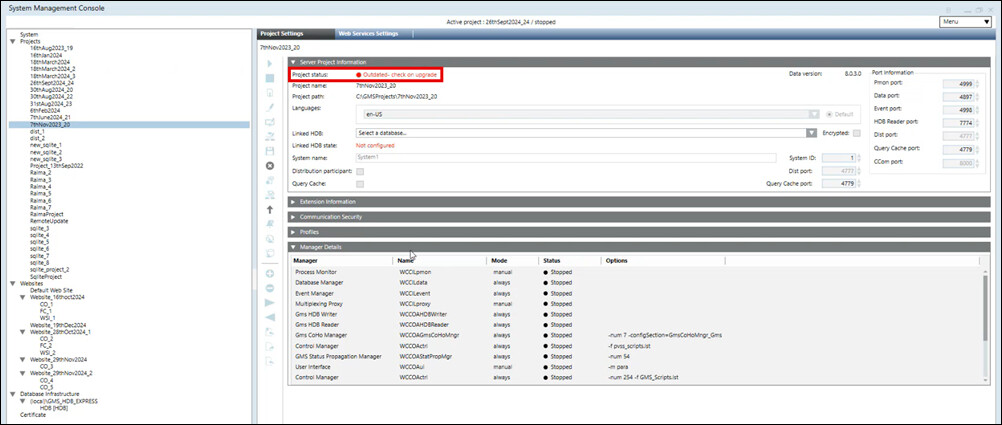 - On confirmation, the project/project template is restored successfully, the project node displays under the SMC tree, the project folder is created at the specified project path, the Start, Stop, Activate, Edit, and Delete Project icons are available and the Upgrade icon is enabled only when the restored project version is older than the installed one.